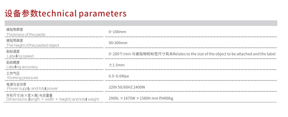 Germany imports high-precision label electric shock, labeling head adjustment base, especially the top belt device. Optional. Hot stamping printer, pneumatic code printer, laser machine, code spraying machine, missing label detection and elimination mechanism, missing code detection and elimination system and receiving platform.